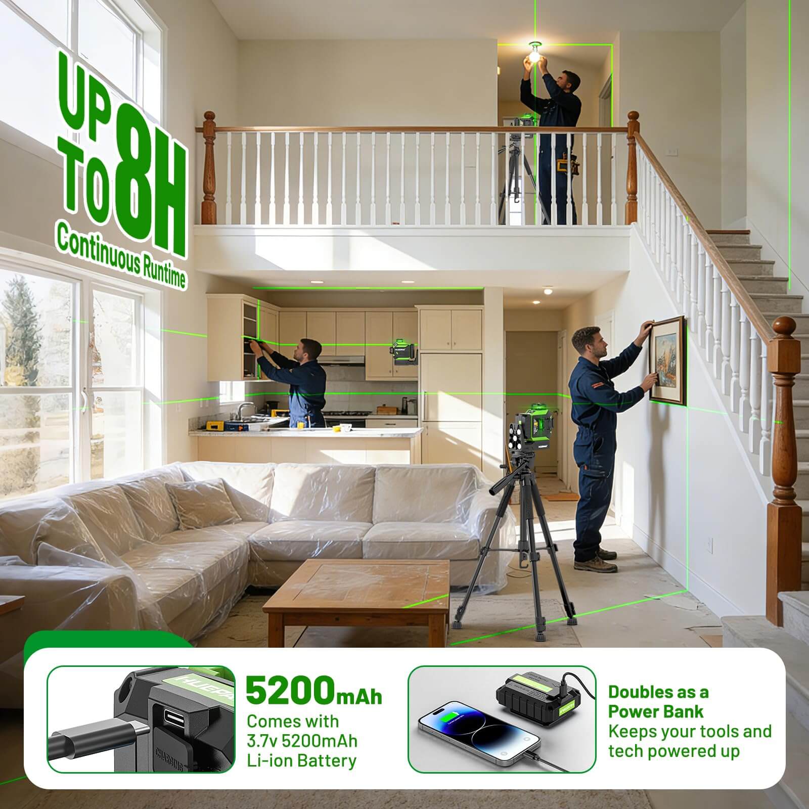 Comes with 3.7V 5200mAh Li-ion battery ensures 8h of continuous site work. Using the integrated USB output allows for charging phones or other essential tech during active tasks. Built-in ports deliver power directly to external devices without interrupting the layout workflow.