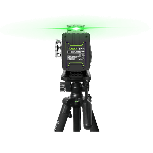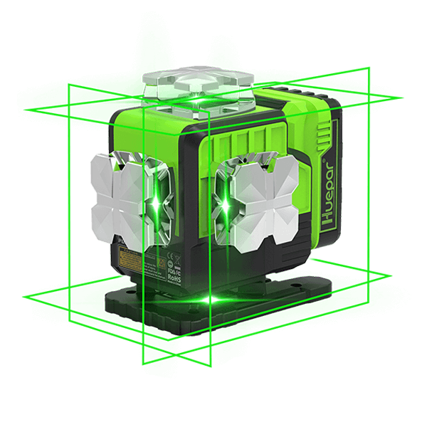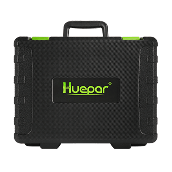 Self-levels within 4°, or switch to manual mode for any angle. Offers a 40m range with ±3mm at 10m accuracy. Outdoor pulse mode with Huepar receiver extends range to 60m.