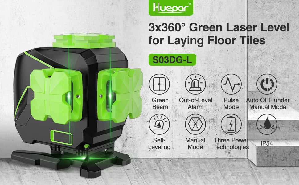 Huepar S03DG floor laser tool generates one 360°horizontal tiling laser on the floor or wall providing all-around leveling coverage for the layout of tile, stone, brick, carpet and hardwood flooring.