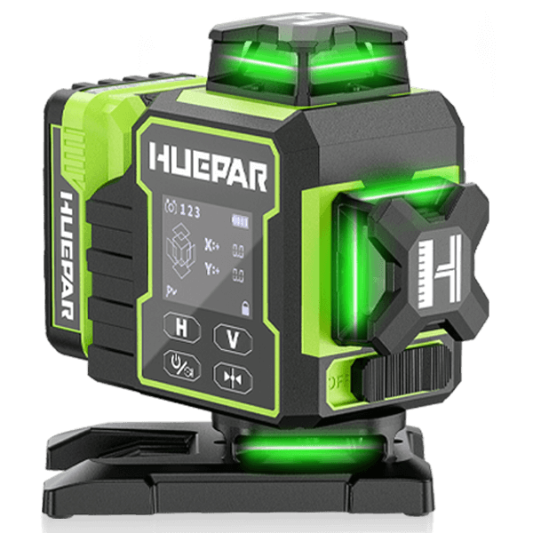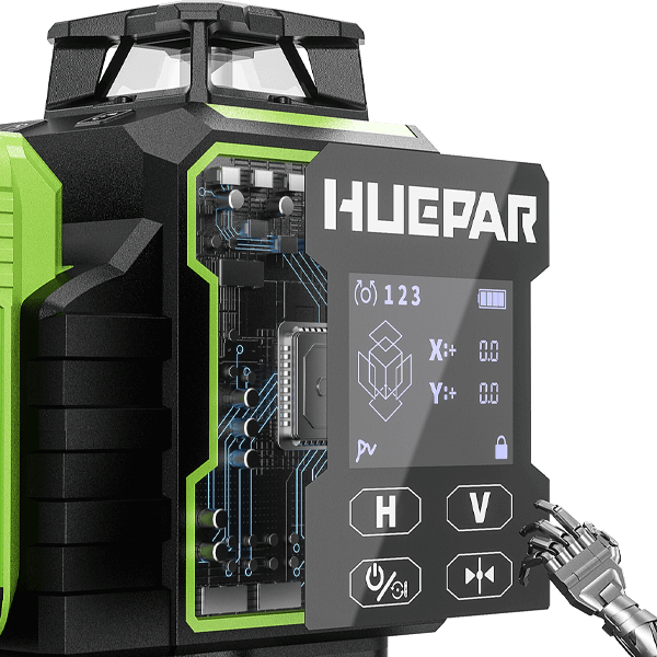 The Huepar W04CG laser level features a high-definition LCD screen that ensures clear visibility of essential parameters even in low-light environments. The screen provides real-time information, including battery level, X/Y axis tilt angles, rotation speed and direction, laser line composition, pulse mode status, and pendulum lock status.